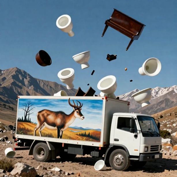 Waltrauds Truck nach einem gezielten Angriff mit Sanitärkeramik